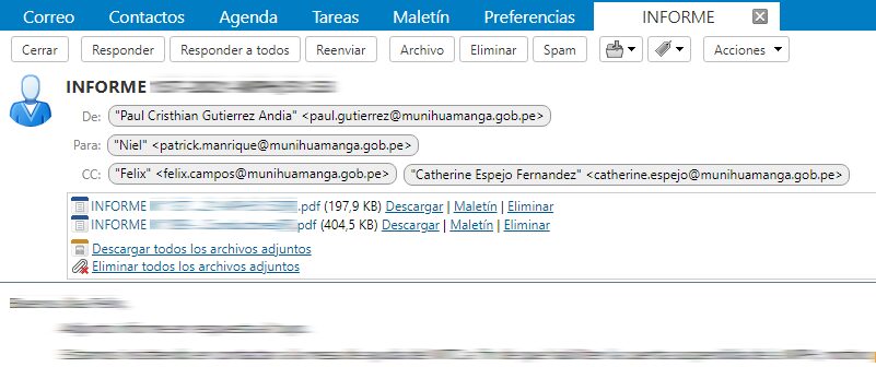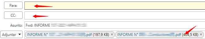 - Reenviar: si se usa esta opción (según el ejemplo arriba mostrado), NO se tomará ninguna dirección de correo relacionado; pero, en este caso SI se tomará en cuenta los archivos adjuntos que se recibió ya que esta opción no se usa para responder sino para compartir con alguien más el correo recibido.