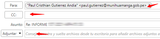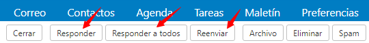 - Responder: si se usa esta opción (según el ejemplo arriba mostrado), se tomará automáticamente la dirección del correo del remitente (De:) y se colocará en la sección (Para:), pero NO se tomará en cuenta las direcciones de correos que se encuentran en con copia (CC:); tampoco no se tomará en cuenta los archivos adjuntos que se recibió; estos últimos no son necesarios ya que es una respuesta que se anexará al correo original.