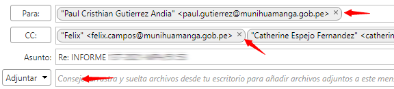 - Cualquiera que sea la opción que utilice, redacte el cuerpo del mensaje, si es necesario añada adjuntos o más direcciones de correo electrónico; pero, no cambie el Asunto para que de esa forma pueda realizar un seguimiento al mismo o facilitar la búsqueda de todos los mensajes relacionados en dicho proceso.