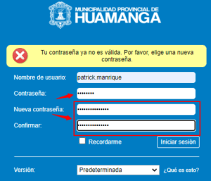 - Se le mostrará este formulario la cual le permitirá cambiar la contraseña temporal por una nueva; aquí debe indicar la contraseña temporal (contraseña) y la nueva que usará para acceder a su cuenta (nueva contraseña y confirmar) y luego haga clic en el botón Iniciar sesión.