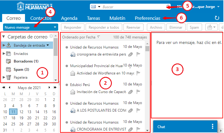 - Carpetas de correos: muestra de forma organizada los mensajes de correo.